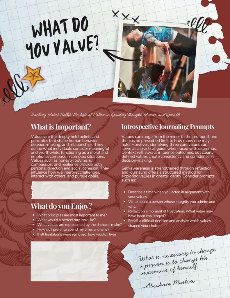 I invite you to download the Core Value Worksheet from the Teaching Artist Toolkit for practical tips to clarify your goals, identify barriers, and create an action plan for forward movement…
