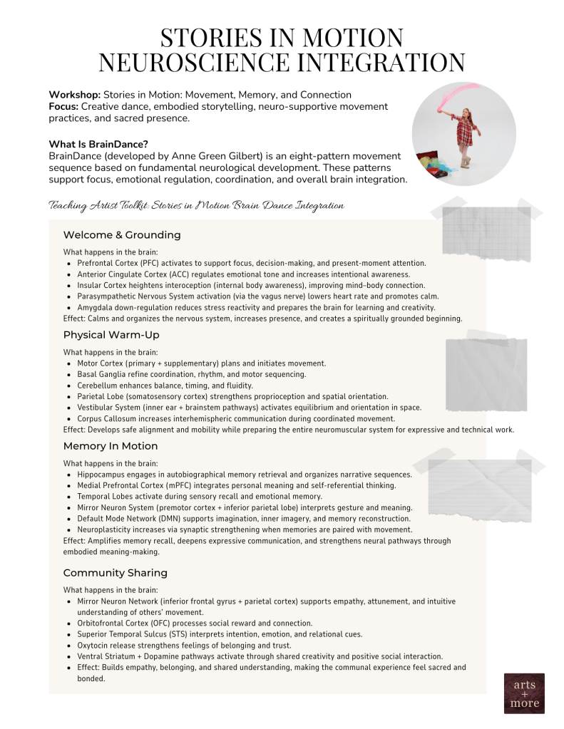 I invite you to download the Stories in Motion Neuroscience Integration Page from the Teaching Artist Toolkit for practical tips to clarify your goals, identify barriers, and create an action plan for forward movement…