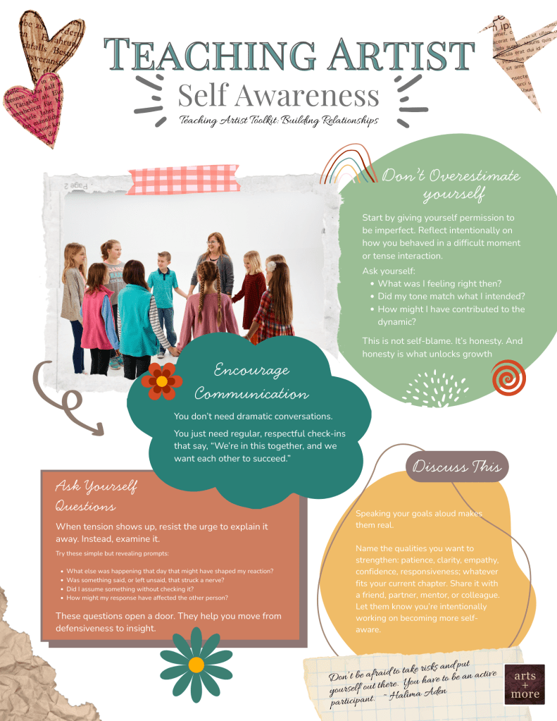 Self-awareness isn’t just a personal virtue. It’s a professional asset. It stabilizes you in the whirlwind of new environments, shifting schedules, and overlapping responsibilities. And for educators and teaching artists whose work depends on relationships, it becomes the foundation of trust, clarity, and collaboration.