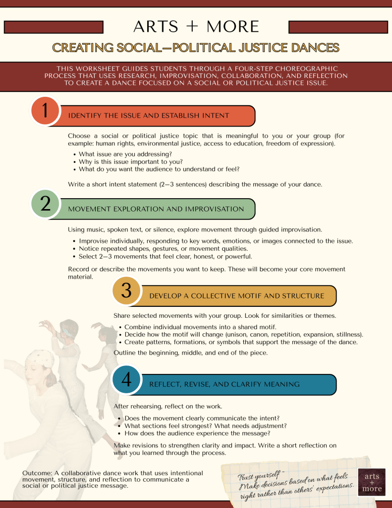 Download this free four-step choreographic process worksheet designed for high school classrooms and studios. It supports critical thinking, collaboration, and student voice while providing clear structure for creative work.