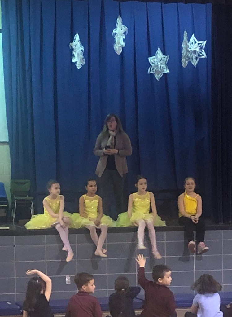 Students contributed a variety of ideas. As their impulse to talk with their hands rose and movement increased, I offered an axial warm-up, then students had the opportunity to explain to the class what that might look like. Then, the ballerina would abstract their ideas and demonstrate them with classical gestures, mime, and ballet steps. Their customized version was celebrated. Following the exciting classroom participation, I shared more about the plot of the Winter Sleighride Production. Students learned of soaring through stars with a flying sled, an enchanted toyshop with a large magical box that brought toys to life. The session would end with a performance demonstration from the ballet, an invitation to attend the event, and a time of question and answer with the dancer.